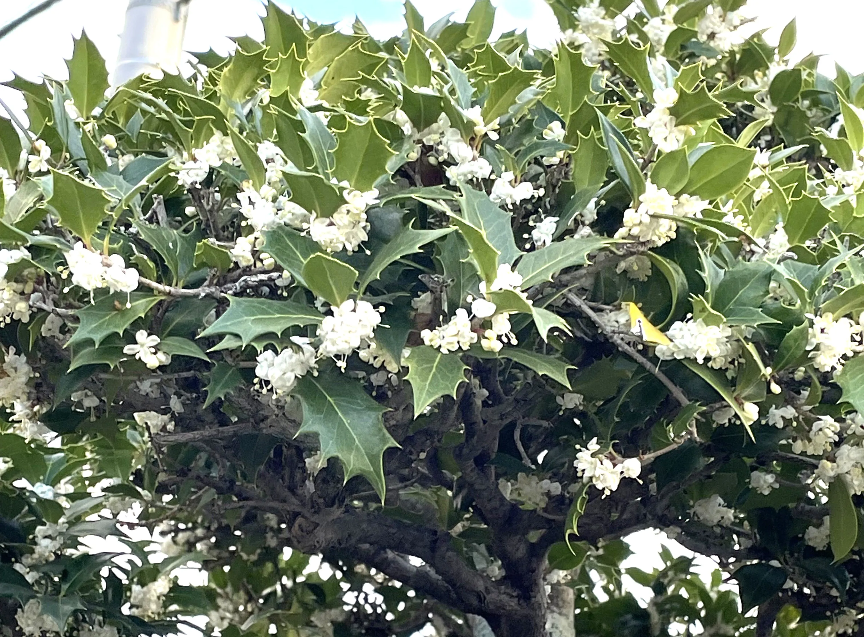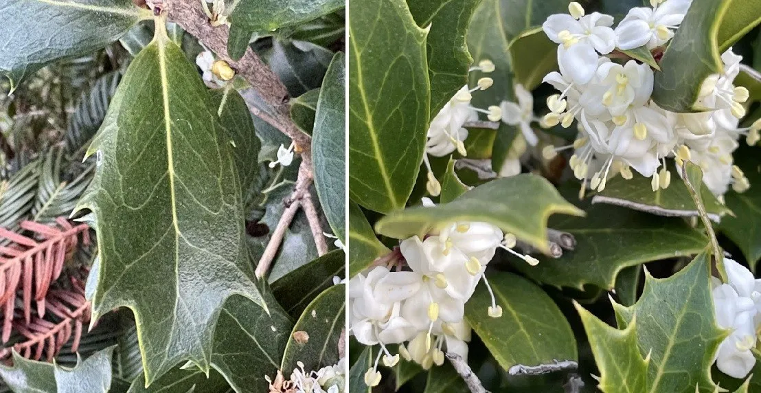 花=写真右側=は特徴的な葉と比べると印象が薄いのですが、11月から12月にかけて花径5mmほどの白い小さな花をつけます。散歩道で見かけ、鼻を近づけると、キンモクセイの香りを柔らかくしたような芳香がしました。柊の語源は