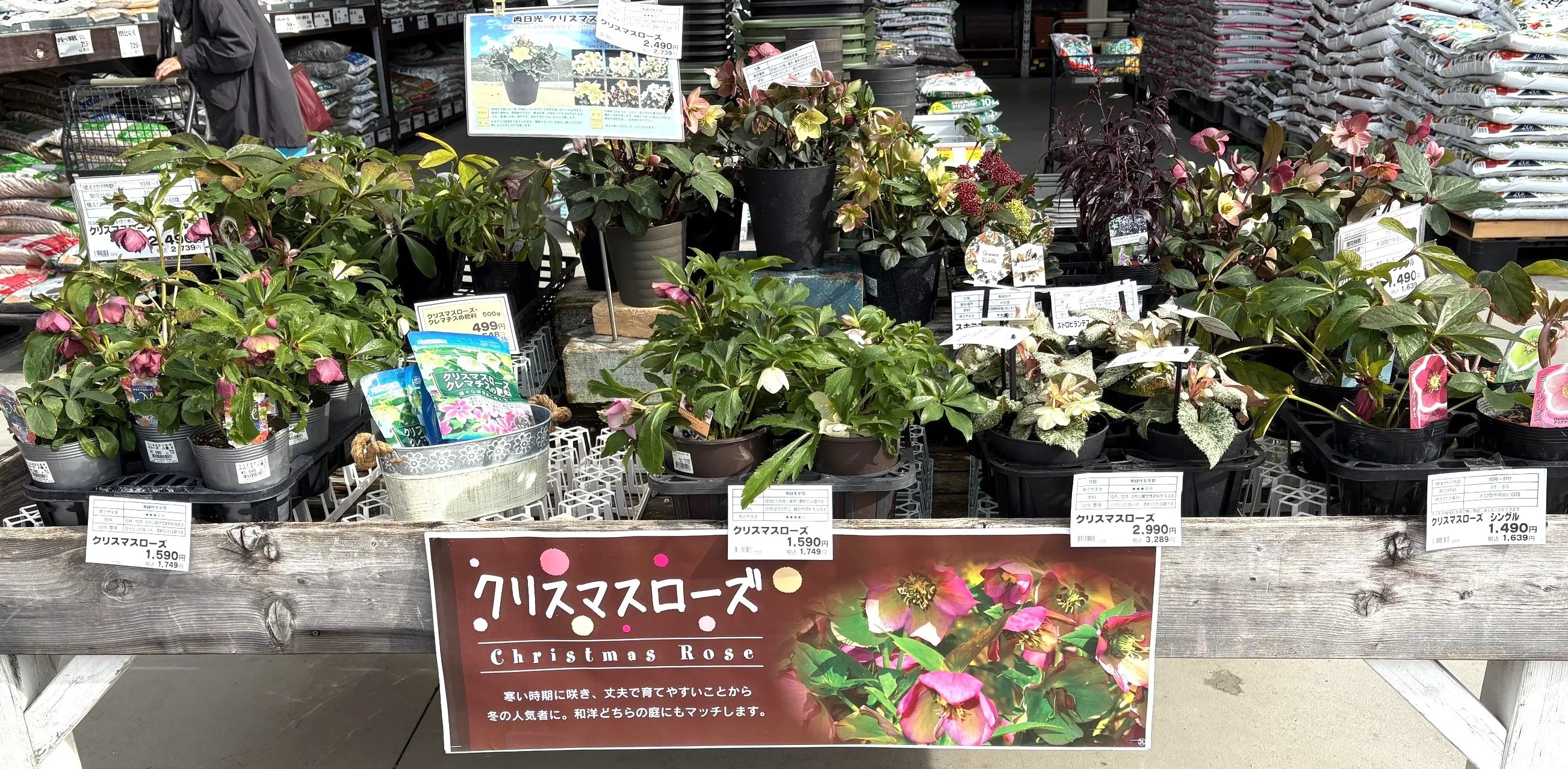第101回:クリスマスローズ~名は体を表さず 2026.2.1 野や山に咲く花はめっきり少なくなり、モノトーンの光景が繰り広げられています。そんな冬枯れの季節に、クリスマスローズはそっと彩りを添えています。 クリスマスローズはキンポウゲ科ヘレボルス属(クリスマスローズ属)の多年草です。ローズの名前がついていますが、バラの仲間ではなく、クレマチスやアネモネなどの仲間です。ヘレボルスは正式な名前(学名)で、白や赤、黄、紫、緑、灰色など多彩な花=写真=を咲かせます。花びらのように見える部分は花弁ではなく、萼片(がくへん)。葉の一部が変化して色づいたものなので散りにくく、2~3か月もの間、鑑賞できます。 最寄りの園芸店をのぞくと、店頭の一番目立つところに「クリスマスローズ」の特別コーナー=写真=が設けられていました。10種類近くの花が並べられていましたが、見た目は「違う品種の花では?」と思うほどバラバラです。種で増やすので、色や形、模様が安定しません。同じような花が咲かないというのが、この花の大きな特徴です。おまけに耐寒性があって育てやすいとあって、人気が高いというのも頷けます。 原産地はヨーロッパ。花の歴史は古く、世界薬用植物百科事典には「紀元前1400年には精神病の治療に使われていた」と記されています。学名のヘレボルスは、ギリシャ語の「ヘレン(殺す)」と「ボア(食べ物)」が語源です。葉や根茎に毒があり、摂取すると嘔吐や腹痛、下痢、呼吸麻痺、精神錯乱、心停止などをひき起こします。昔は強心剤や下剤などとして使われこともありますが、今では毒性が強過ぎるので薬としては使われていません。 クリスマスの名前が付いているのに、クリスマスの頃には余り見かけません。花の盛りはクリスマス・シーズンが過ぎた1月から4月にかけてです。どうして名前と花期がずれているのでしょうか? それにしても、これほど名前と実態が合わない花は珍しいのではないでしょうか。「クリスマス」と「ローズ」を組み合わせた名前の花なのに、クリスマスの頃には殆ど見かけず、バラ科の花でもない。名前が人や物の実体を表していることを「名は体を表す」と言いますが、この花に関しては名は体を表していません。それなのに、クリスマスローズの名前は違和感なく受け入れられています。それだけ魅力があり、普及しているということなのでしょう。 寒風の中でうつむき加減に、ひっそりと佇む姿から、クリスマスローズは“冬の貴婦人”とも言われます。この愛称の方は、名は体を表しているようです