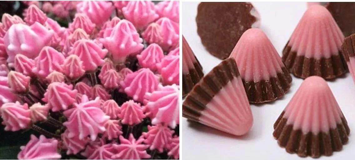 美味しそうに見える花が、こんな毒を持っているなんて……。まさに裏切られた思いがします。グラヤノトキシンはカルミアだけでなく、レンゲツツジ=写真左側=、アセビ=写真中央=、ネジキ=写真右側=などツツジ科の多くの草にも含まれているので注意が必要です。宇宙船をイメージしたチョコレート