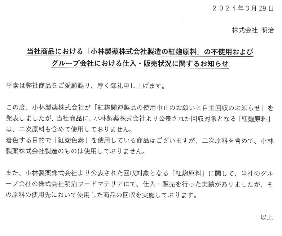 小林製薬の紅麹の成分を含むサプリメントを摂取した人が腎臓病などを発症したことから、同製薬は紅麹関連商品の使用停止を呼びかけるとともに、自主回収を急いでいます。「お知らせ」は、明治製菓の製品は小林製薬が回収している紅麹原料を二次原料を含めて使っていないというものでした。健康食品が健康を害した